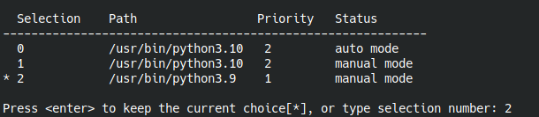sudo update-alternatives --install /usr/bin/python3 python3 /usr/bin/python3.9 1