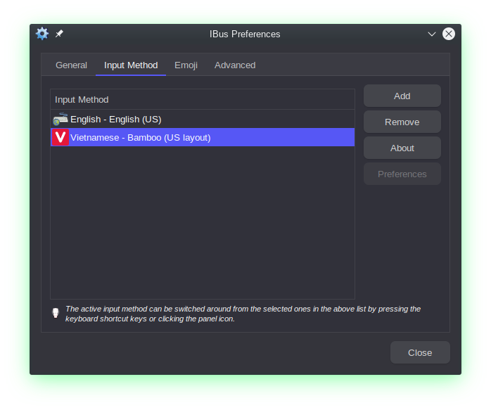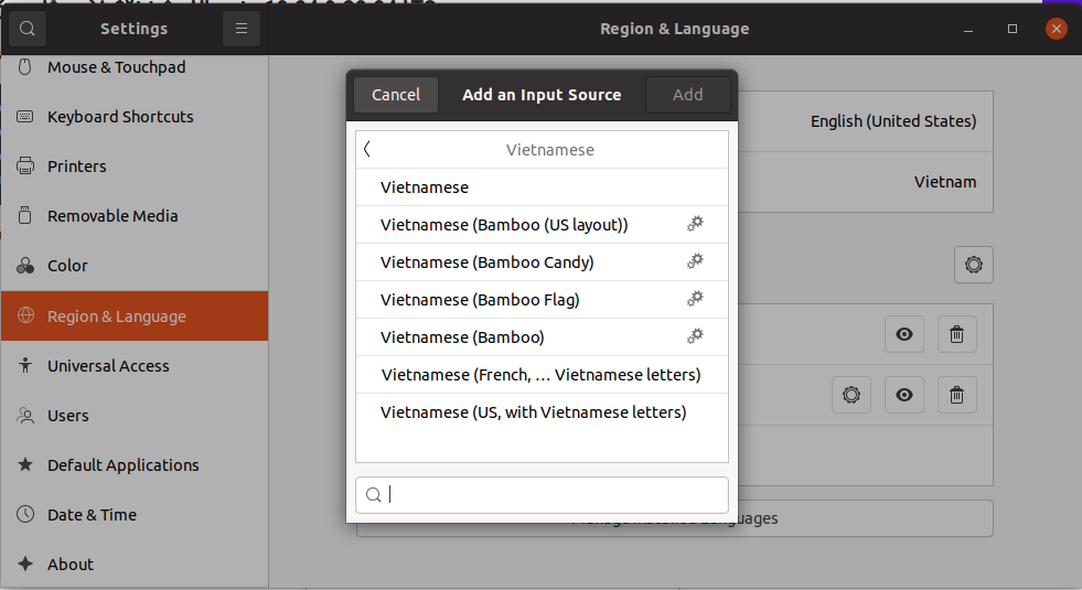 Chuyển qua tab Input Method > Chọn “Add” > Chọn dấu “…” > Chọn “Vietnamese” > add bộ gõ ibus-bamboo vào > Close
