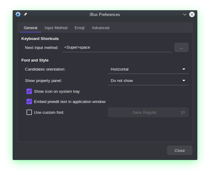 - Show icon on system tray: hiện icon ibus trên Widget system tray (nên bật)