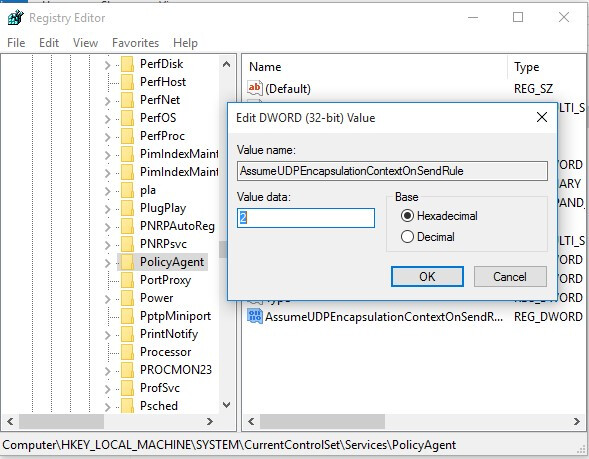 - Tạo một tham số DWORD với tên AssumeUDPEncapsulationContextOnSendRule và giá trị 2;