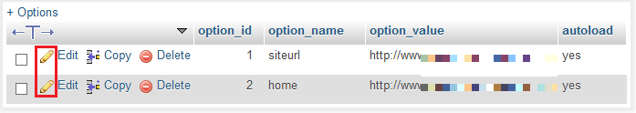 Xác định hàng siteurl và hàng home . Nhấp vào biểu tượng bút chì bên cạnh mỗi để chỉnh sửa.